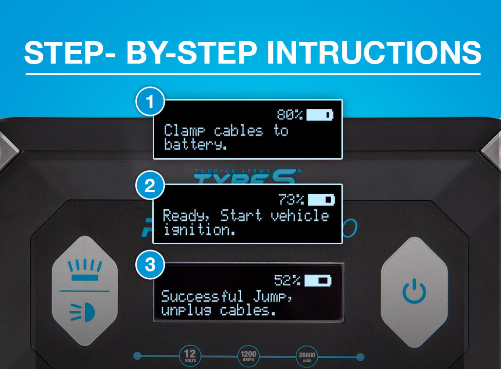 The Intelli-Step LCD screen displays step-by-step jump-starting instructions to get you back on the road. Simply connect the jumper cables and follow the on-screen Jump Guide prompts.